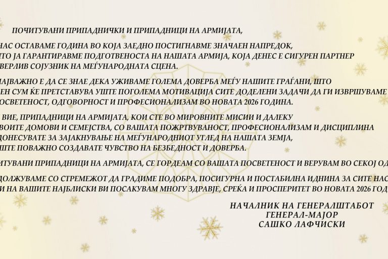 Честитка од началникот на Генералштабот на Армијата, генерал-мајор Сашко Лафчиски до припадничките и припадниците на Армијата по повод Нова година ГЕНЕРАЛШТАБ30.12.2025